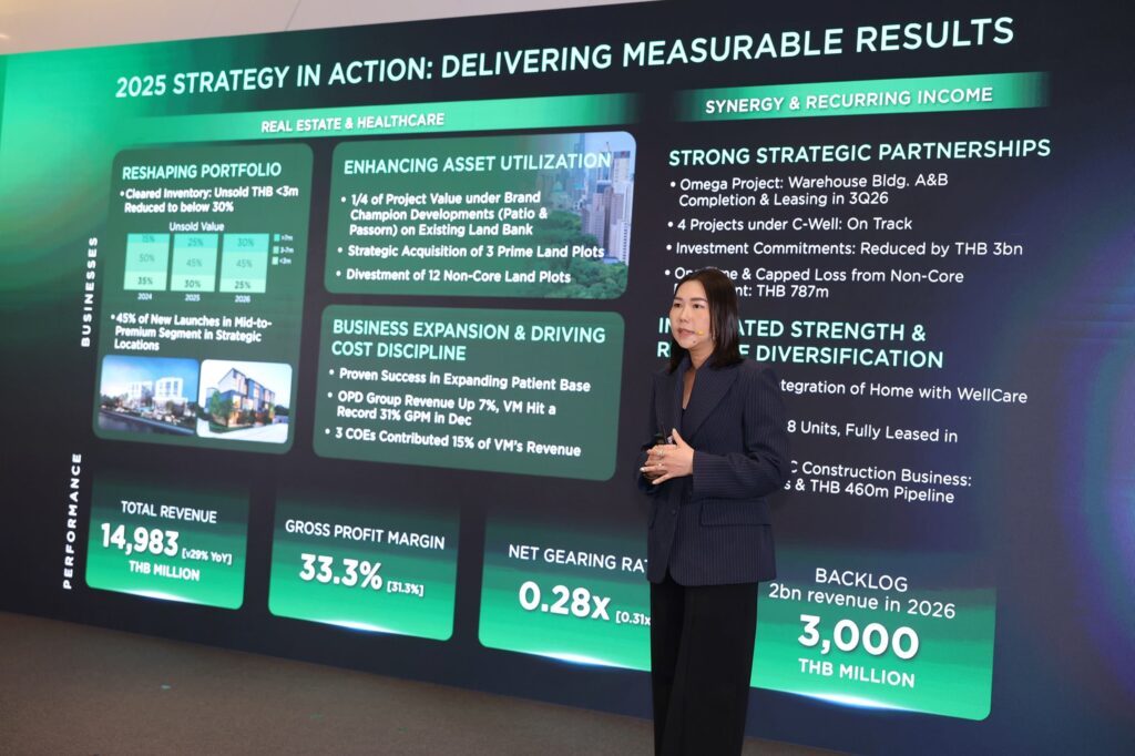 พฤกษา โฮลดิ้ง โชว์ความเหนือชั้นในการปรับตัวเชิงกลยุทธ์ท่ามกลางความผันผวนของตลาด สะท้อนความสำเร็จของกลยุทธ์ Reshaping Portfolio ในปี 2568 จากการปรับพอร์ตโฟลิโอสู่ตลาดระดับกลางถึงบน ลดสัดส่วนธุรกิจที่ไม่ใช่แกนหลัก และยกระดับคุณภาพโครงการให้สอดรับกับกำลังซื้อ ส่งผลให้บริษัทฯ สามารถรักษาอัตรากำไรขั้นต้น (GPM) ได้สูงถึง 33.3% จากรายได้รวม 14,983 ล้านบาท ท่ามกลางภาวะตลาดที่ผันผวน ตอกย้ำประสิทธิภาพการบริหารพอร์ตและวินัยทางการเงินอย่างเป็นรูปธรรม พร้อมเปิดฉากปี 69 ด้วยกลยุทธ์ใหม่ภายใต้กรอบ “Asset-Optimized, Capital-Efficient, Well Living-Focused” มุ่งเปลี่ยนสินทรัพย์ให้เป็นโอกาสเพื่อสร้างรายได้ระยะยาว บริหารเงินทุนอย่างมีวินัย ยกระดับ แบรนด์ผ่านความร่วมมือด้านสุขภาพและบริการครบวงจร ตั้งเป้าปี 69 กวาดรายได้ 18,800 ล้านบาท ธุรกิจเรียลเอสเตท เตรียมเปิดตัว 7 โครงการใหม่ มูลค่ารวม 8,200 ล้านบาท ดันรายได้ 15,000 ล้านบาท ส่วนธุรกิจ เฮลท์แคร์เครือวิมุตลุยเดินหน้ากลยุทธ์ความเป็นเลิศ ปักธงสร้างรายได้ 2,600 ล้านบาท
