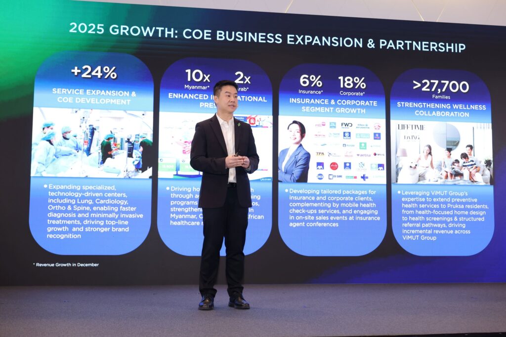 นายแพทย์นิพัฒน์ กุหลาบขาว ประธานเจ้าหน้าที่บริหาร บริษัท โรงพยาบาลวิมุต โฮลดิ้ง จำกัด กล่าวเสริมว่า ธุรกิจโรงพยาบาลในเครือวิมุตเติบโตได้อย่างต่อเนื่องในปี 2568 โดยมีรายได้รวม 2,243 ล้านบาท เพิ่มขึ้นจากปีก่อนหน้า 3% และมีกำไรจากการดำเนินงาน (EBITDA) 232 ล้านบาท เติบโตเท่าตัว โดยโรงพยาบาลวิมุต พหลโยธิน เริ่มทำกำไรรายไตรมาสได้กว่า 12 ล้านบาท และในเดือนธันวาคม 2568 มีอัตรากำไรขั้นต้นสูงสุดตั้งแต่ก่อตั้งโรงพยาบาลมา ซึ่งเป็นผลมาจากการขยายการบริการดูแลรักษาในสาขาหลัก เช่น สุขภาพปอด หัวใจและหลอดเลือด และกระดูกและข้อ รวมถึงการเติบโตของลูกค้าประกัน ลูกค้าองค์กร และการเติบโตของกลุ่มผู้ป่วยต่างชาติ ทั้งเมียนมา (เติบโตขึ้น 10 เท่า) กลุ่มอาหรับ (เติบโต 2 เท่า) จีน และแอฟริกา ในช่วงเดือนธันวาคมที่ผ่านมา ในส่วนของโรงพยาบาลวิมุต-เทพธารินทร์ นอกจากความเป็นผู้นำด้านการป้องกันและรักษาผู้ป่วยเบาหวาน ไทรอยด์ และต่อมไร้ท่อแล้ว ยังสามารถสร้างรายได้เพิ่มจากการโปรโมทศูนย์ตรวจสุขภาพและยกระดับการดูแลสุขภาพเชิงป้องกัน กับบริษัทขนาดใหญ่โดยรอบและลูกบ้านพฤกษา เพื่อให้เข้าถึงการรักษาพยาบาลได้ง่ายขึ้น