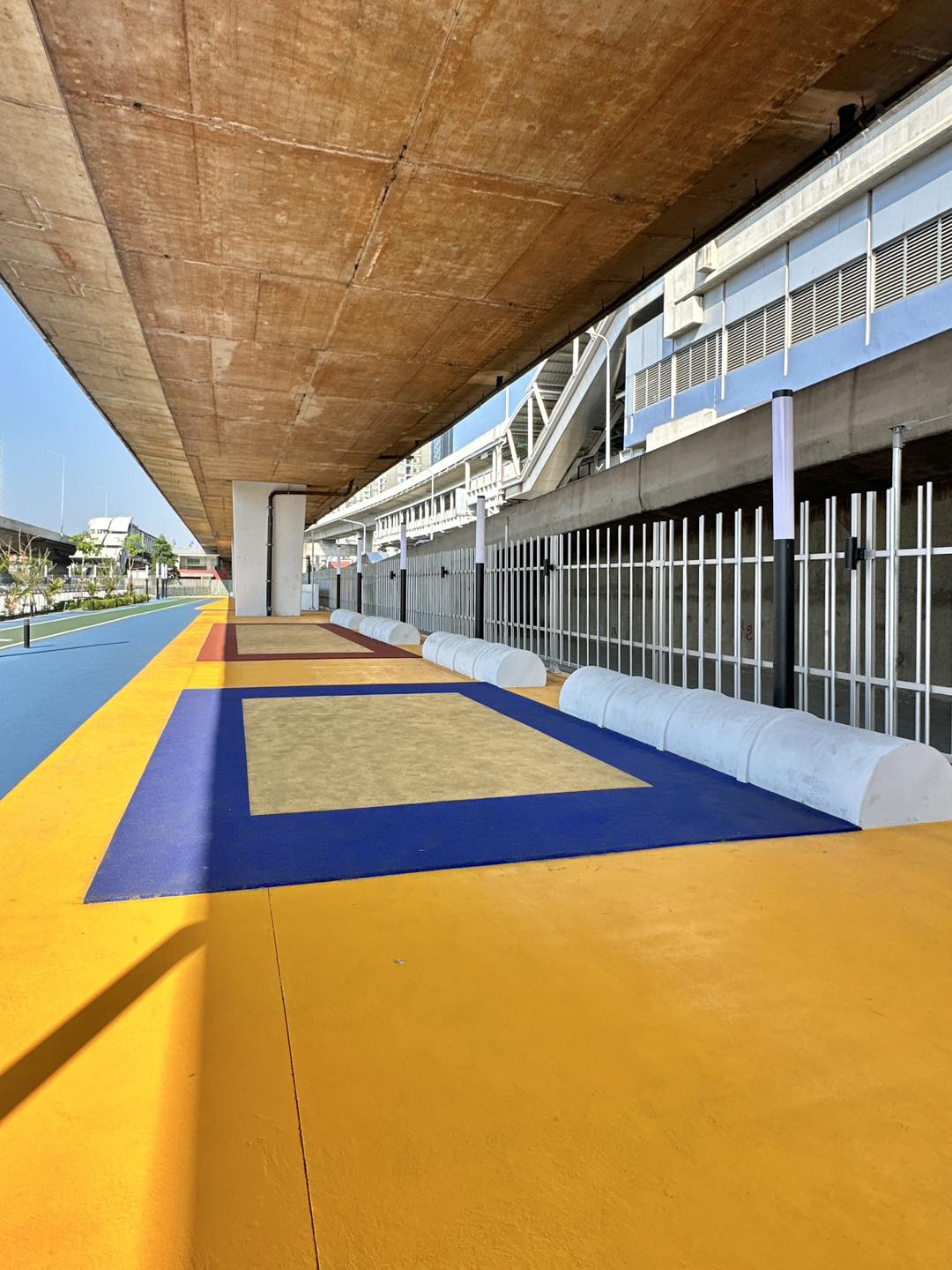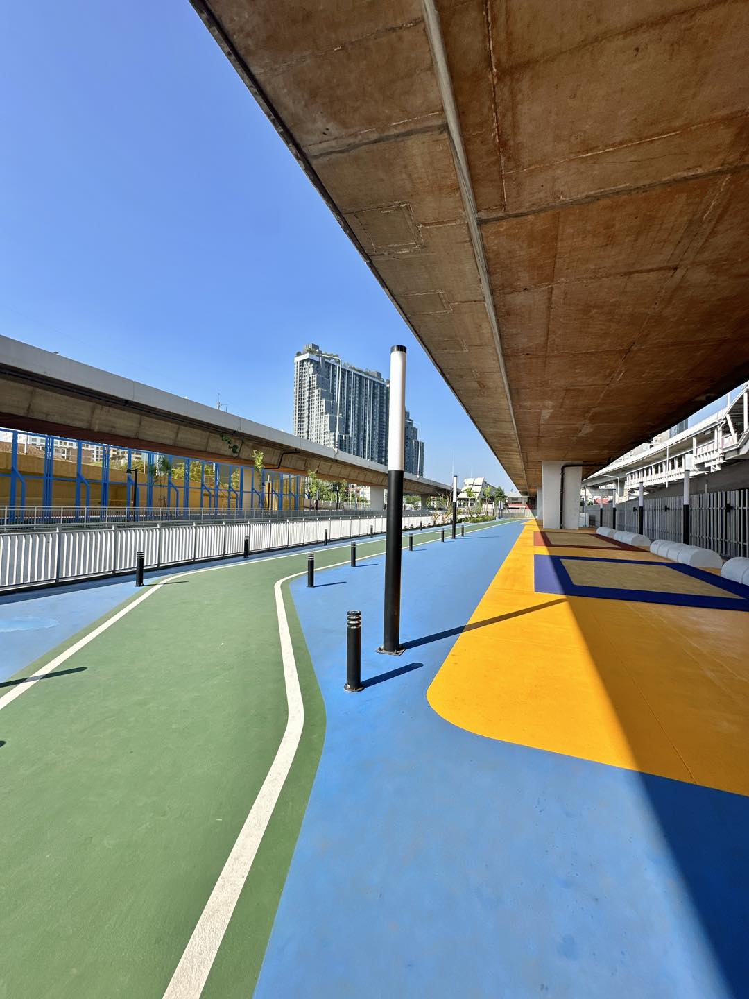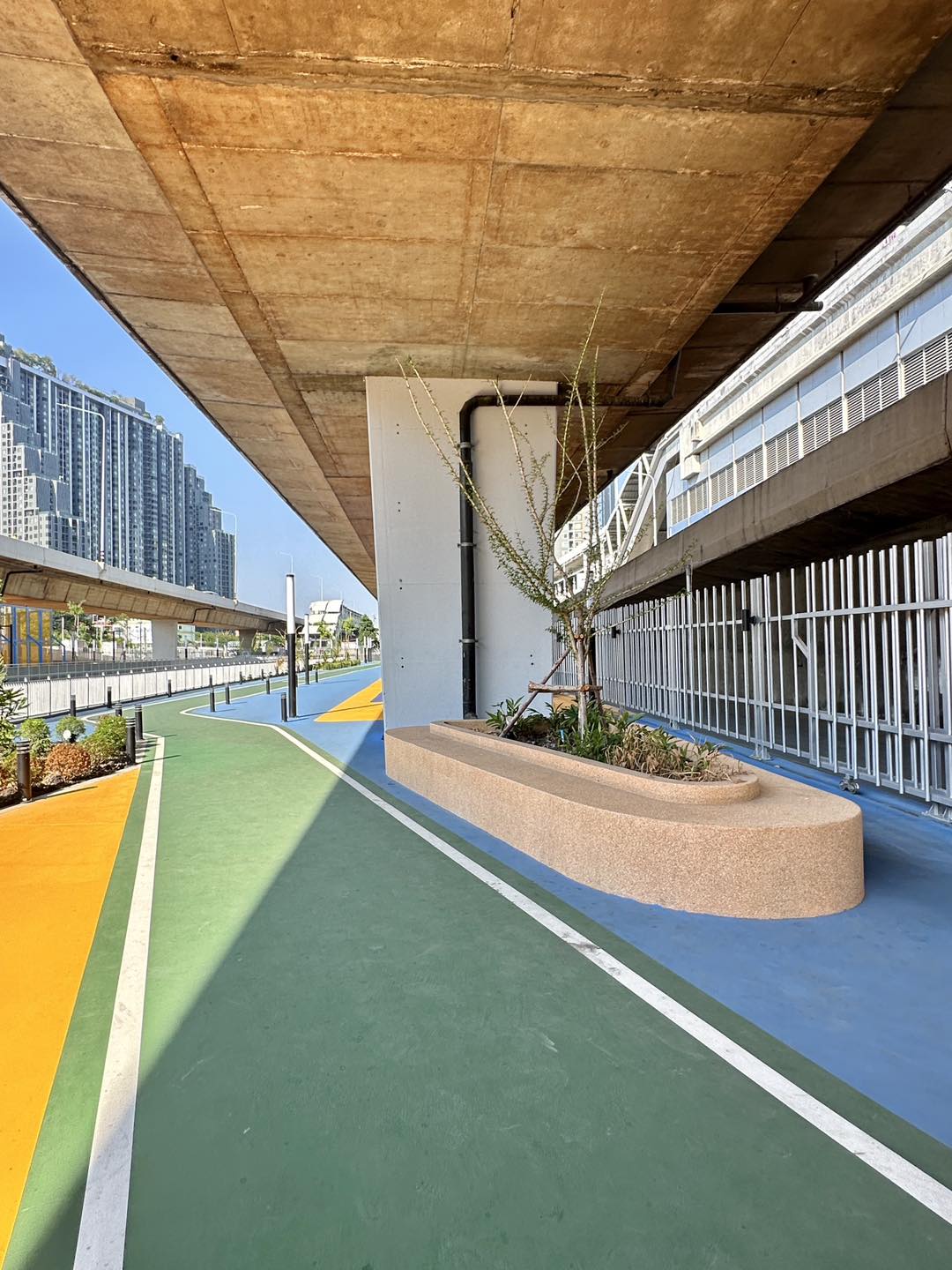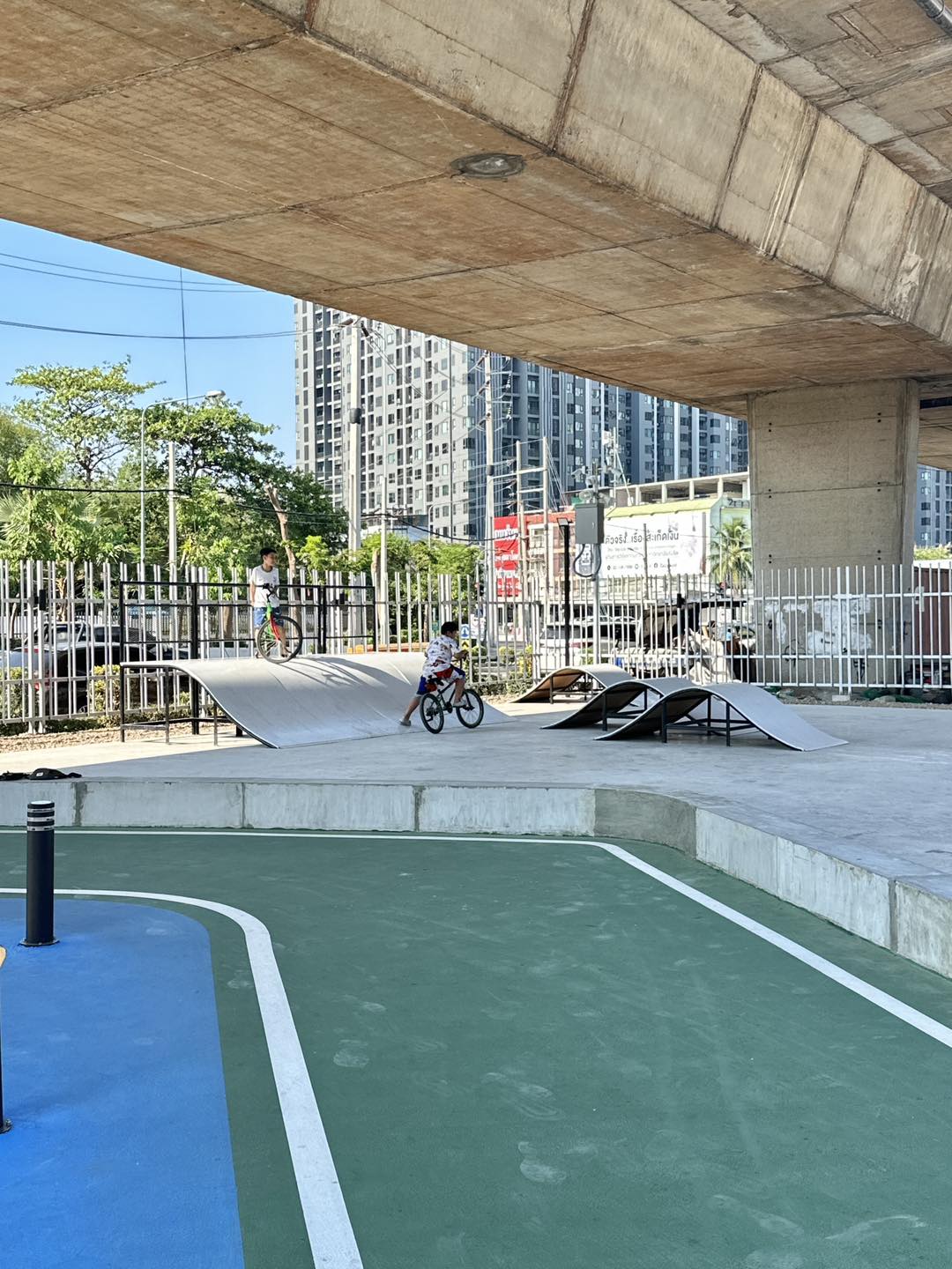 ภายในมีทั้งที่วิ่งรอบคลอง, สนามบาสเก็ตบอล, ลานสเก็ตบอร์ด, ปั่นจักรยาน, ลานอเนกประสงค์พื้นแบบ Soft Floor สว. มาเต้นแอโรบิคได้ และที่นั่งต่างๆ ข้อดีคืออยู่ใต้ถนนลอยฟ้าครับ ก็ได้ร่มเงาบังแดดไปในตัว