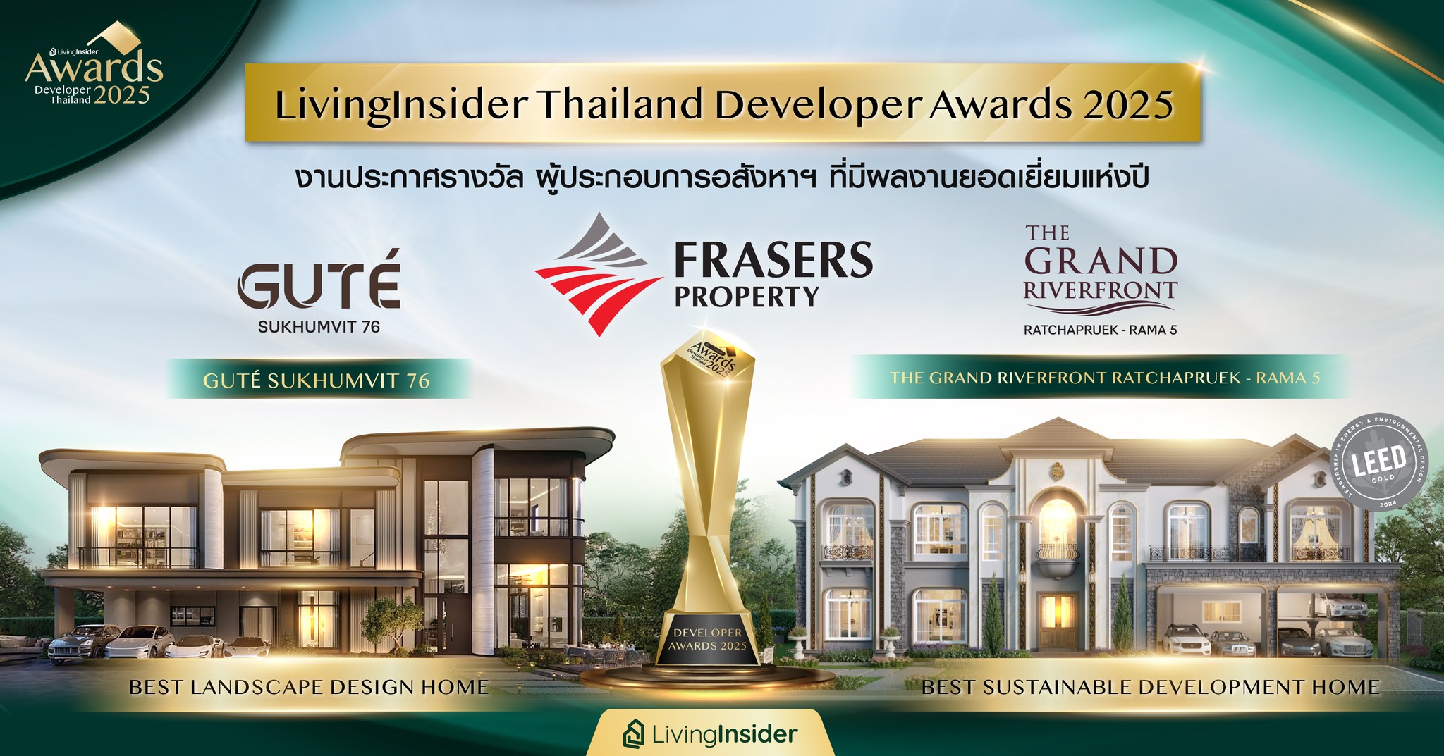 บ้าน Frasers Property ปีนี้คว้า 2 รางวัล จากงาน LivingInsider Thailand Developer Awards 2025 จากผลงานโดดเด่นเรื่องการออกแบบ Landscape และการเปนบ้านต้นแบบการพัฒนาที่ยั่งยืน