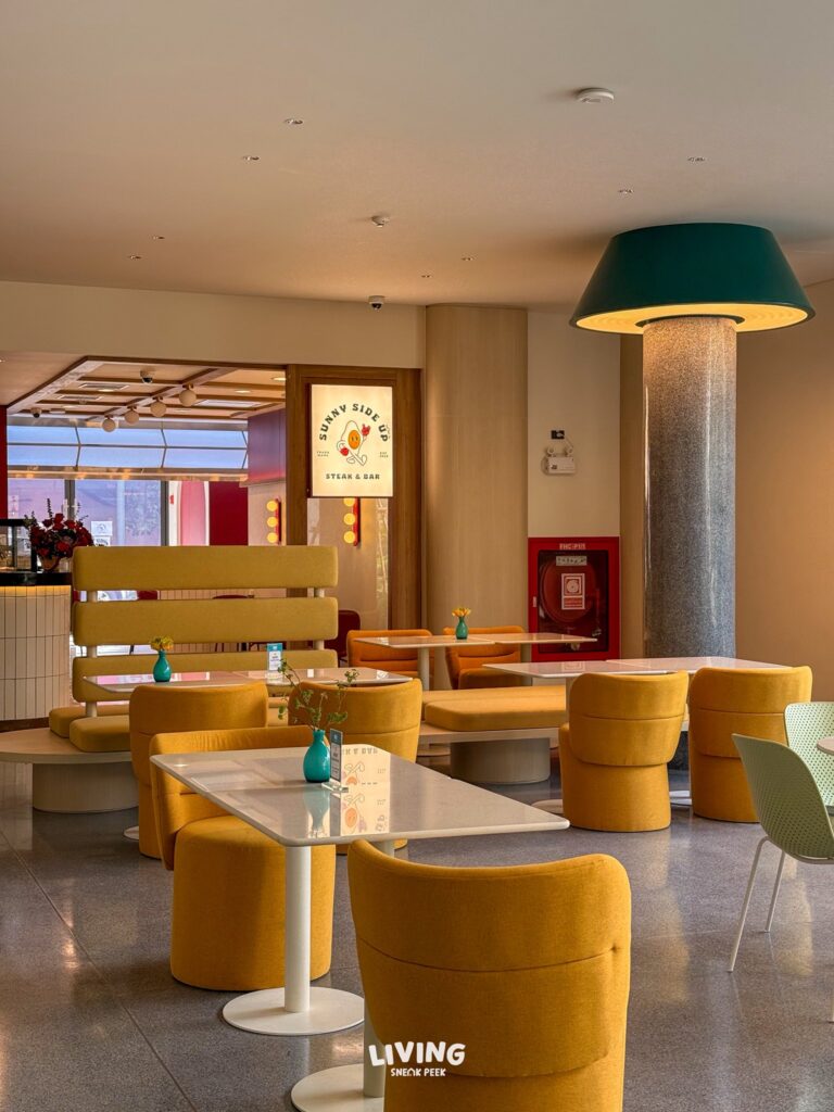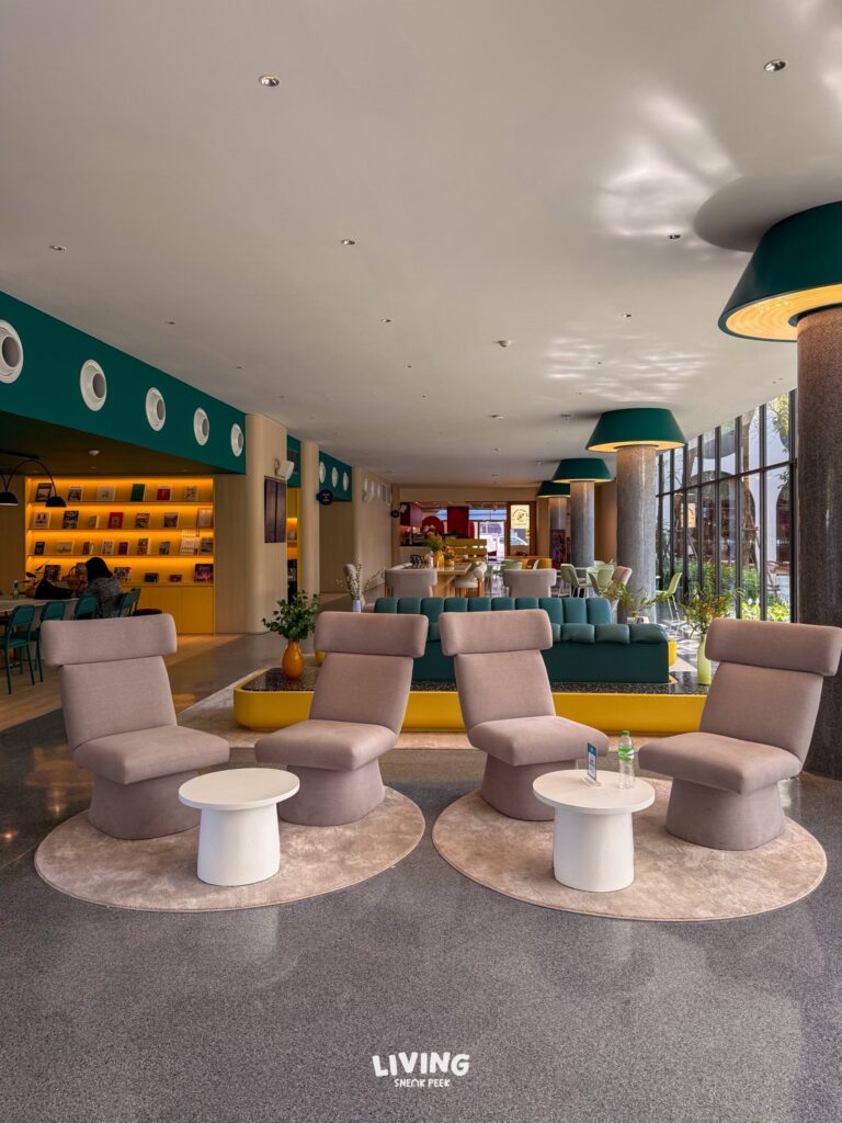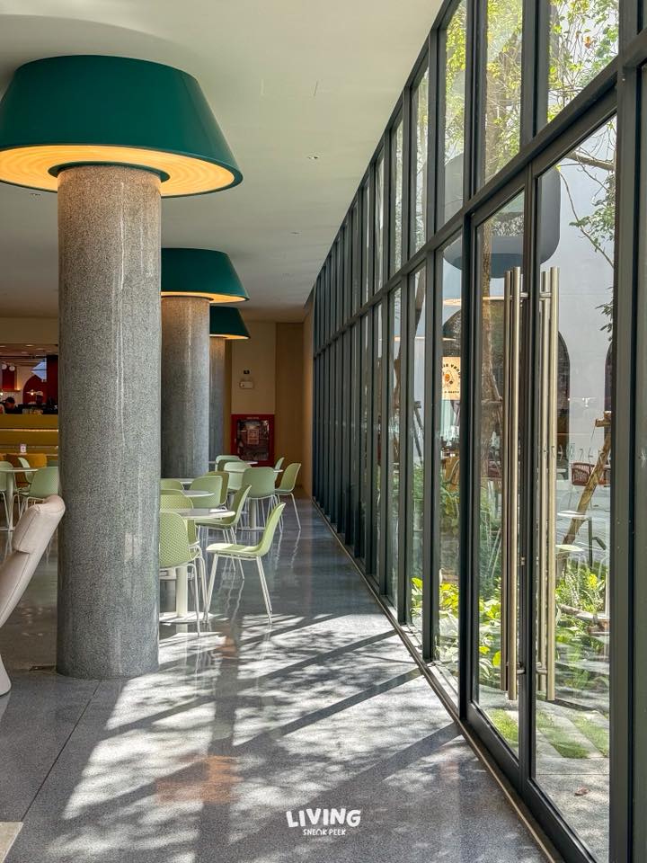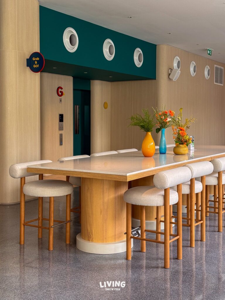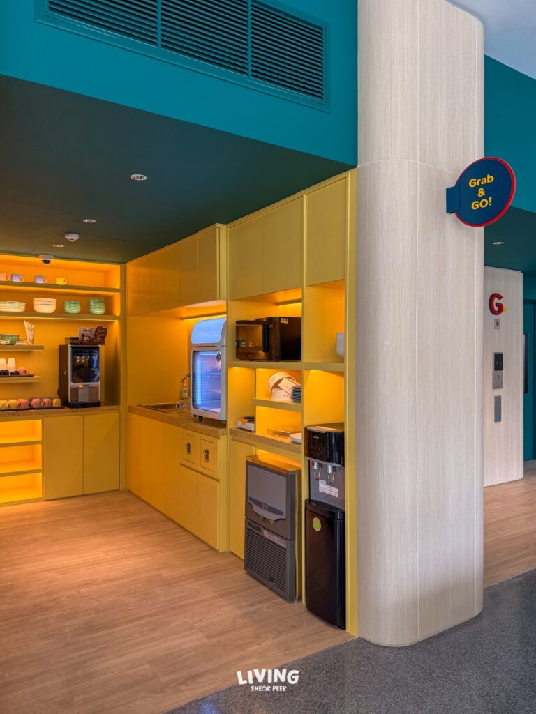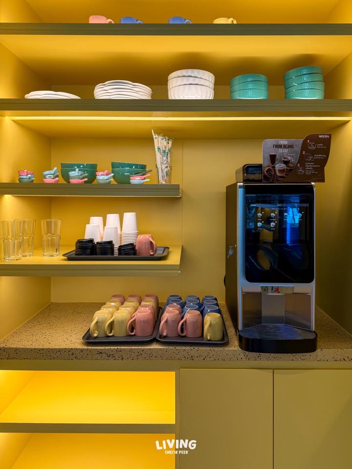 เค้ามีพื้นที่ส่วนกลางให้นั่งทำงาน เล่นบอร์ดเกม แล้วก็สามารถลงมากดน้ำ เติมน้ำแข็ง และคาเฟอีนได้ฟรีตลอด 24 ชม. ส่วนอาหารการกินไม่ต้องห่วงเพราะนอกจากร้านสเต็กชั้นล่าง ก็มีโรบินสันส่วนตัวให้เดินไปกินไปช็อปได้สบาย