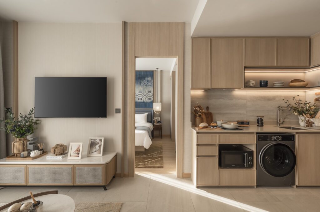 7. ห้องที่นี่มีให้เลือก 3 Type ได้แก่ 1 Bedroom ขนาด 45 ตร.ม. / 2 Bedroom ขนาด 83-86 ตร.ม. / 3 Bedroom ขนาด 129 ตร.ม. ทุกห้องตกแต่งให้ครบเรียบร้อยครับ ทั้งเฟอร์นิเจอร์ครบชุด เครื่องใช้ไฟฟ้า Built-in อ่างอาบน้ำ ผ้าม่าน วัสดุและมาตรฐานก่อสร้างเดียวกับกับโรงแรมห้าดาวในเครือ Marriott ผมยกตัวอย่างเช่น เค้ามีผนังกันเสียงในโรงแรมยังไง มีระบบทำน้ำร้อนยังไง หรือแม้แต่ระบบกรองน้ำ UV คอนโดนี้ก็ได้เหมือนกันเลย เรียกว่าพร้อมเข้าอยู่ในบรรยากาศเดียวกัน