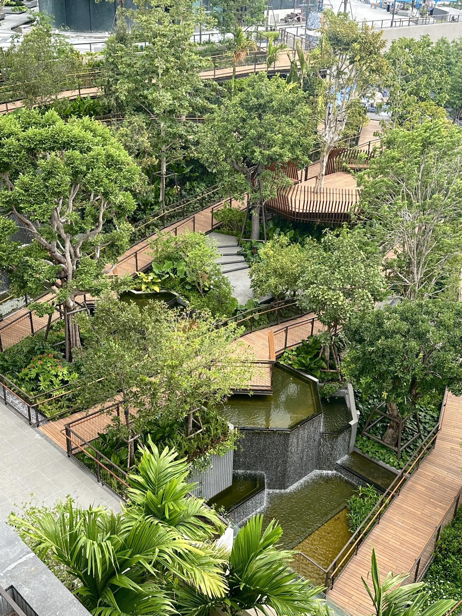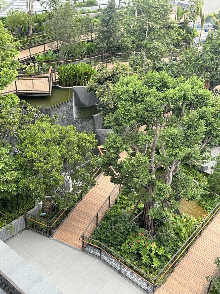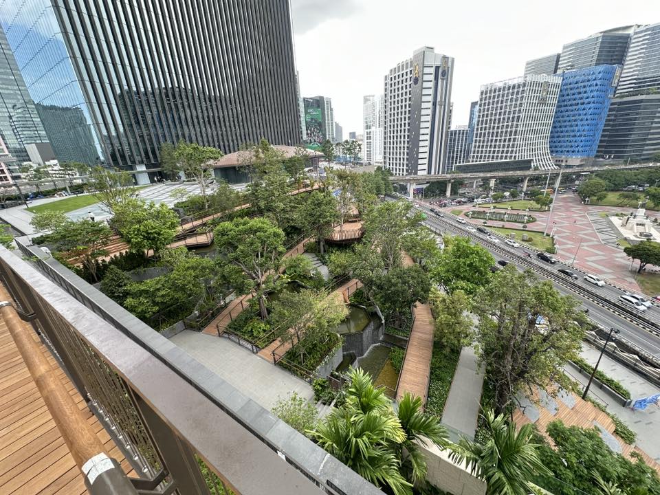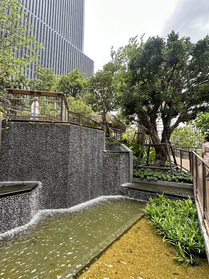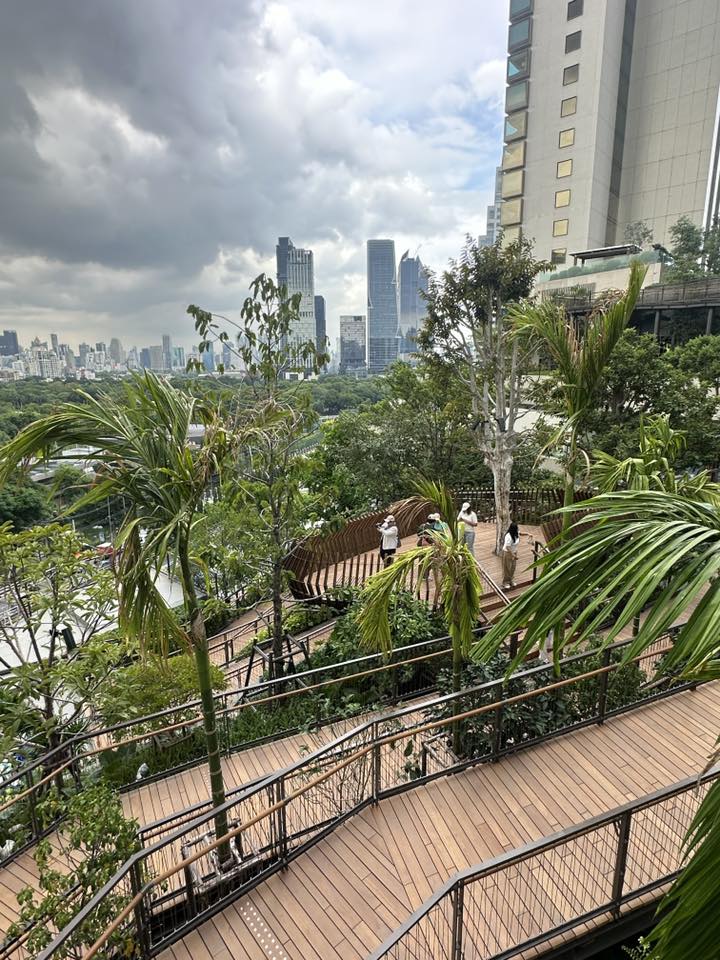 สวนแห่งนี้เหมือนเป็นหัวใจหลักของ Dusit Central Park เป็น Oasis สำหรับคนที่เข้ามาใช้บริการห้าง, โรงแรม, สำนักงาน และที่พักอาศัย รวมถึงคนทั่วไปที่ผ่านไปผ่านมา ให้มีสวนมาพักผ่อนหย่อนใจ ซึ่งผมว่าธรรมชาติมันเพิ่มความกระชุ่มกระชวยให้ชีวิตคนเมืองได้มากเลย เค้าออกแบบให้เหมาะกับทุกเพศทุกวัย โดยจะเป็นทางเดินเทรลตั้งแต่ชั้น 4-7 ขนาดรวม 11,000 ตร.ม. ที่เค้ารวบรวมพืชพรรณไม้ไทยทั้งหมด เช่น ต้นจิกน้ำ, กระบก, มะกอกน้ำ และตะแบก รวมถึงการจำลองแอ่งน้ำและน้ำตกเล็กใหญ่ไว้ทั่วบริเวณ เป็นอีกพื้นที่ช่วยดูดซับคาร์บอนไดออกไซด์ เติมออกซิเจน รวมถึงเป็นบ้านให้นก แมลงปอ สัตว์เล็กสัตว์น้อย เค้าออกแบบตามหลัก Biophilic Design และ Universal Design รองรับการใช้รถเข็นด้วยครับ