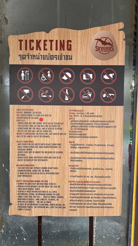 จากประสบการณ์การเล่น วิวด้านบนสูงมากกก แต่ก็ได้วิวกรุงเทพในมุมใหม่ๆ ที่สวยด้วย มาวันนี้ลมเย็นกระแทกหน้าชาเลย 555 อารมณ์เหมือนเรานั่งอยู่บนเจ้า Garudapterus บินไปมา ไม่ได้พาดิ่งขึ้นลงเร็ว จะค่อยๆ พาเราหมุนขึ้นลงในความเร็วที่พอให้สนุก แต่คือมันสูงมากกก ภรรยานั่งกรี๊ดตลอดเวลา ส่วนผมก็หลับตาประมาณ 90% ใน 1 ขานั่งได้ 2 คน ทั้งหมด 12 ขา 24 คนต่อรอบ ข้อกำหนดผู้เล่นคือต้องมีความสูง 120 ซม. ขึ้นไปครับ ซึ่งรอบๆ เครื่องจะมีร้านอาหารและเครื่องดื่มให้สำหรับใครที่ไม่เล่น ก็ขึ้นมาชมได้ครับ