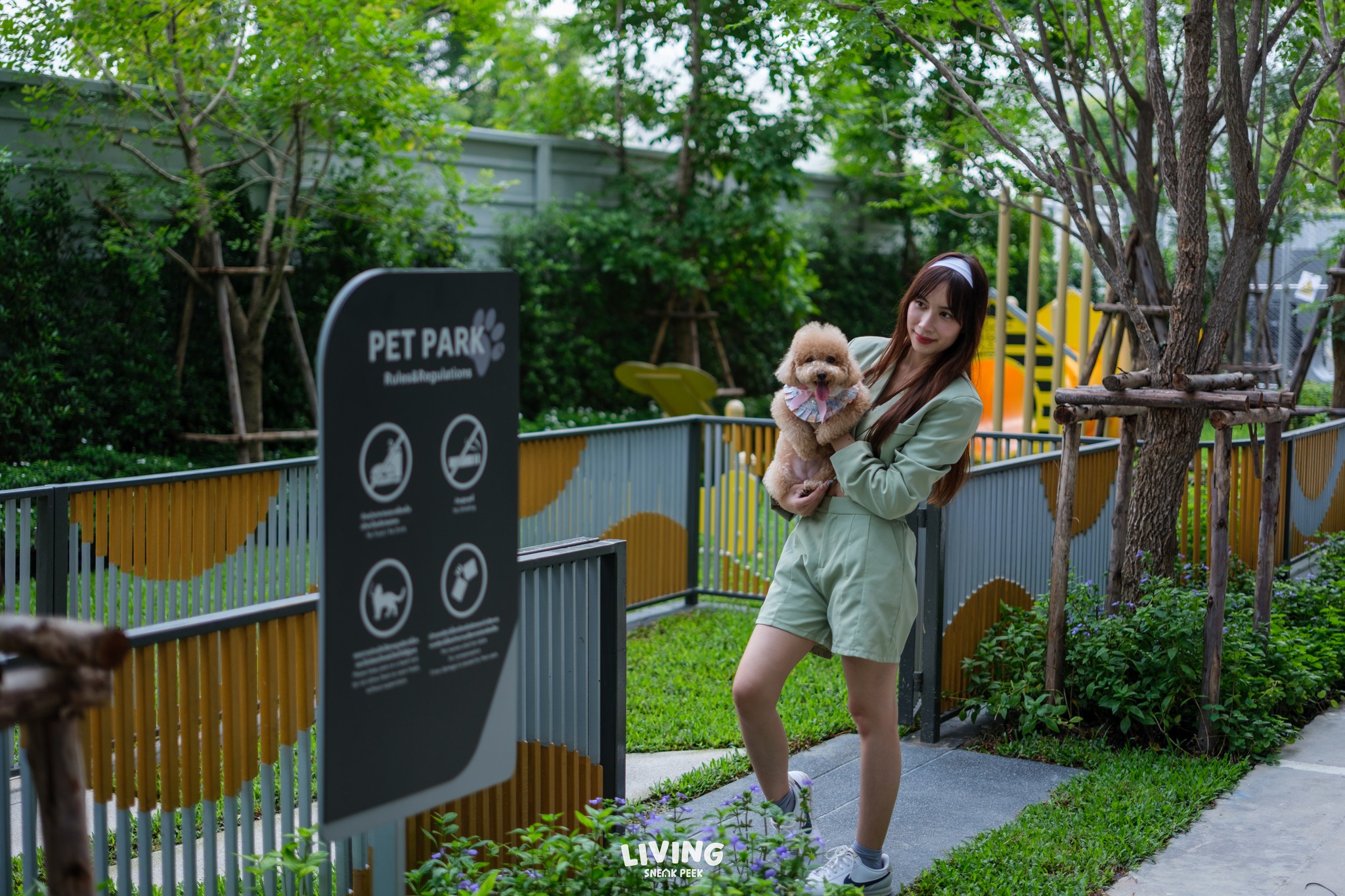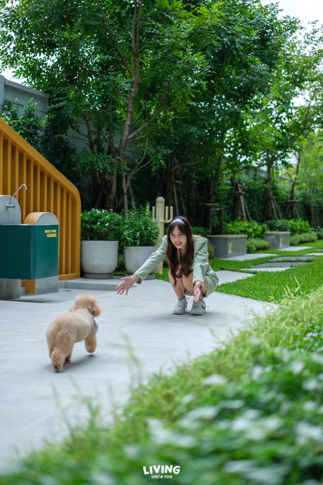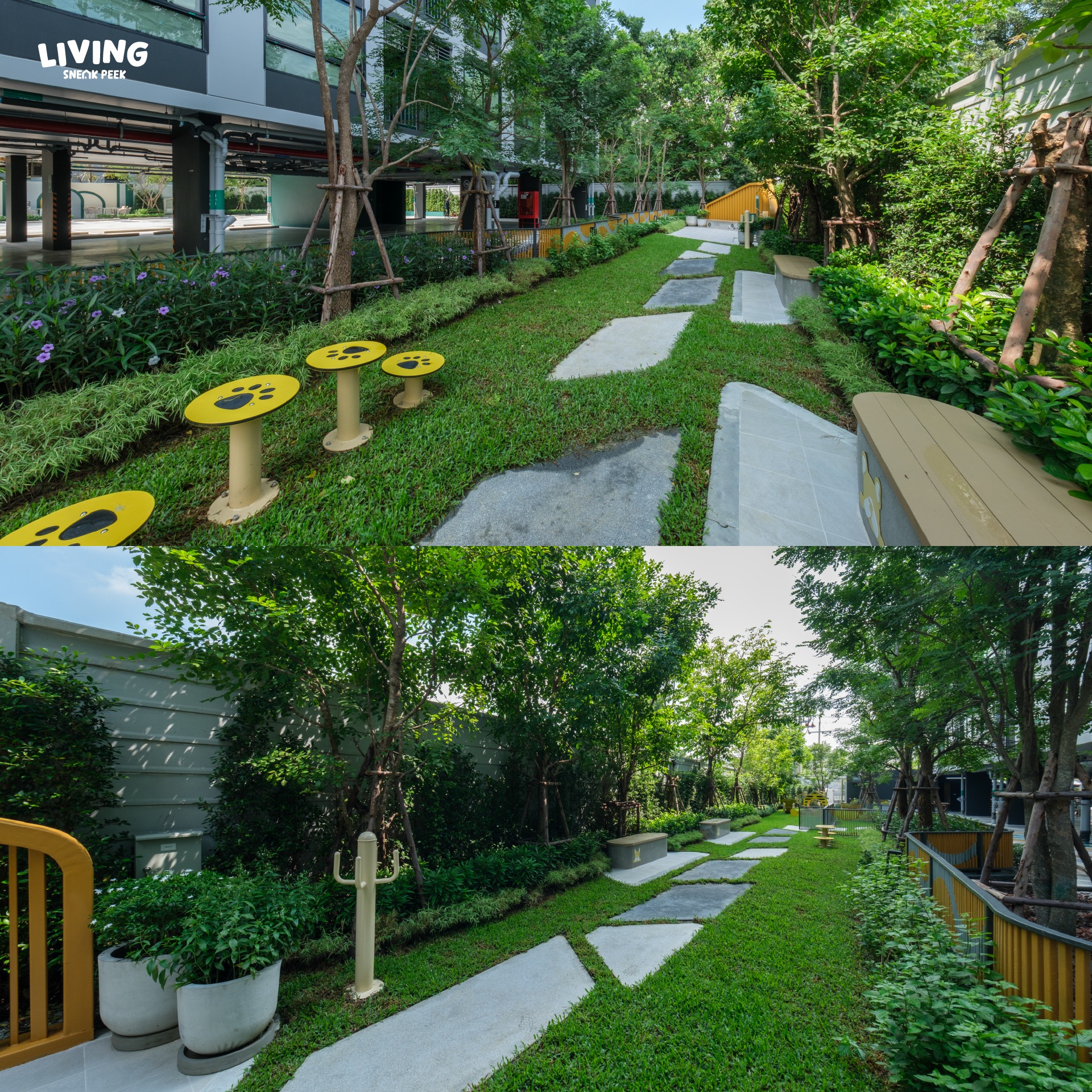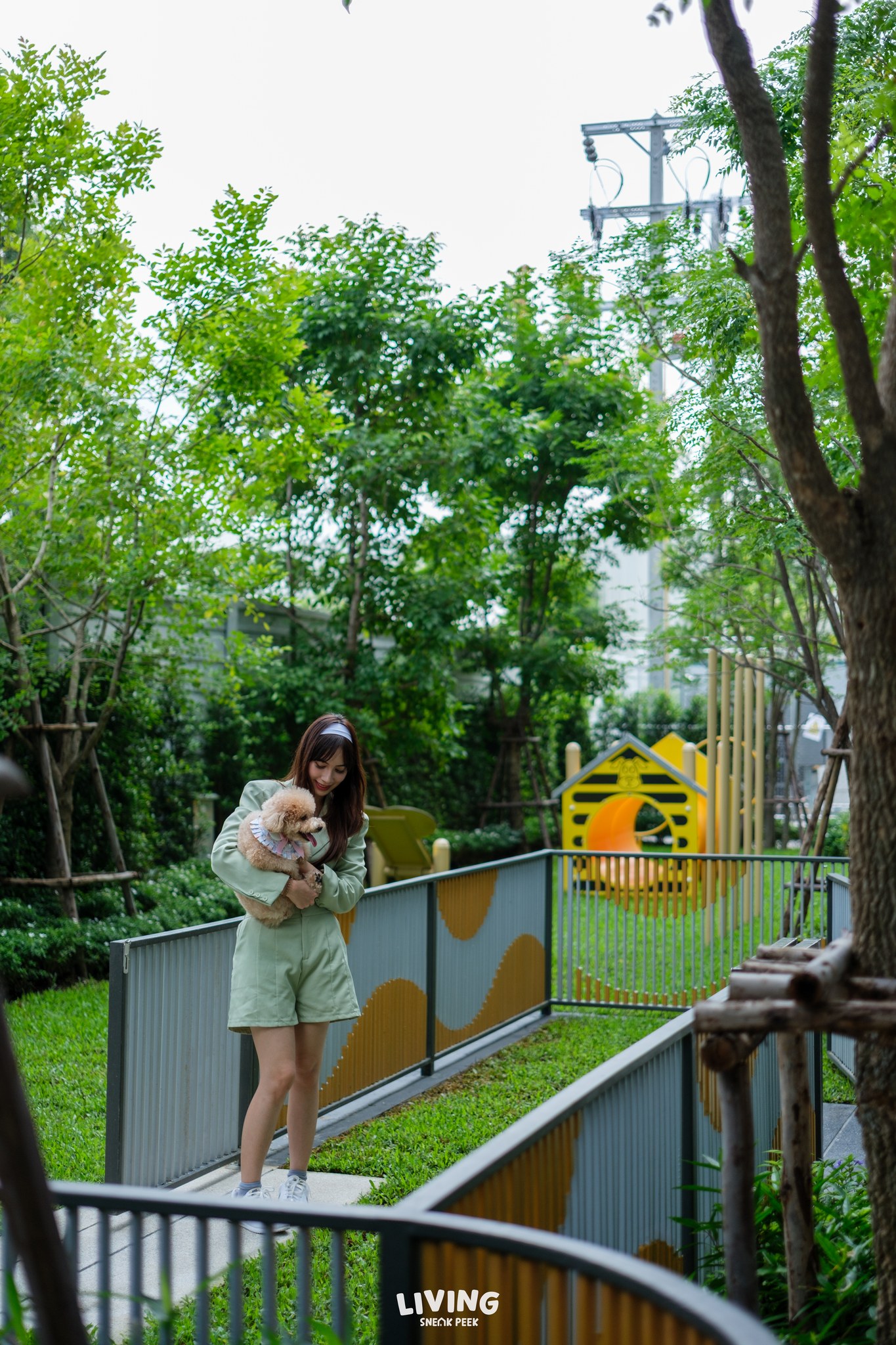 4. ตัวโครงการมีจำนวนยูนิตไม่มากแค่ 261 ยูนิต เป็นตึกเตี้ย 8 ชั้น บรรยากาศดี ผมชอบการออกแบบสวนที่อยู่ด้านในที่มันร่มรื่น มีทั้งไม้ดอก พืชผักสวนครัว สำหรับคนเลี้ยงหมานี่ต่อให้อยู่บ้านมีสวนส่วนตัวแบบผมนะ ลูกสาวก็ชอบออกมาสำรวจข้างนอกอยู่ดี การมีพื้นที่ให้นั่งเล่นในสวน มี Pet Park ที่เลือกพืชพรรณที่เป็นมิตรกับน้องมาปลูก มีอุปกรณ์ครบถ้วน ทั้งมุมนั่งพักผ่อน ของเล่น สนามหญ้า พร้อมที่ทิ้งขยะ ก๊อกล้างเท้าน้อง มีก๊อกให้เราล้างมือ แถมปลั๊กไฟให้นั่งชาร์จมือถือเล่นนี่คือคิดมาเผื่อคนเลี้ยงด้วย เหมาะมาก