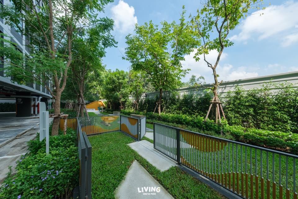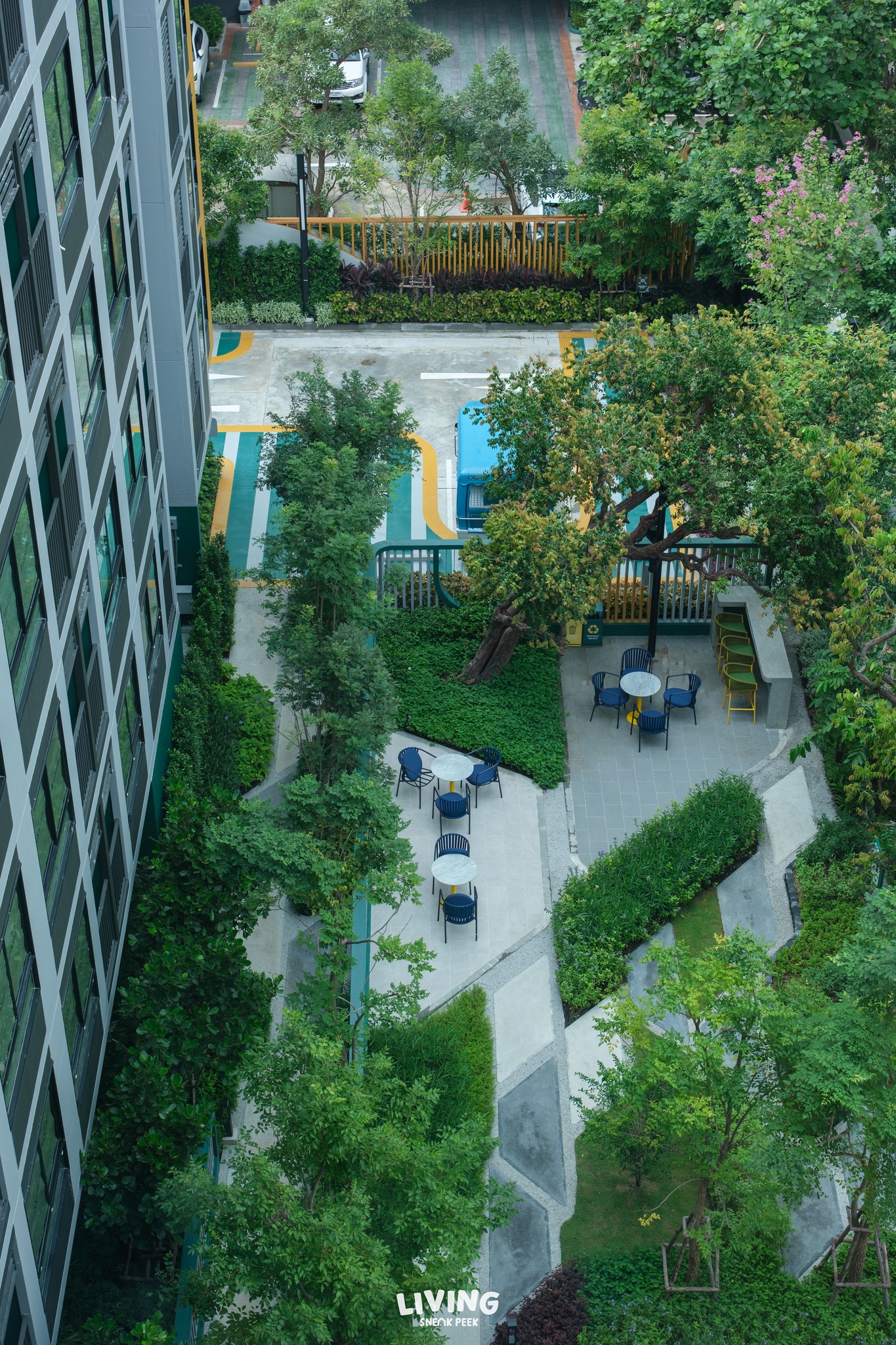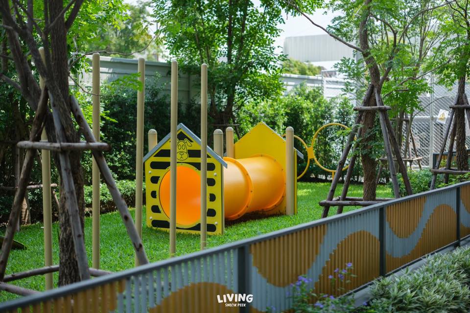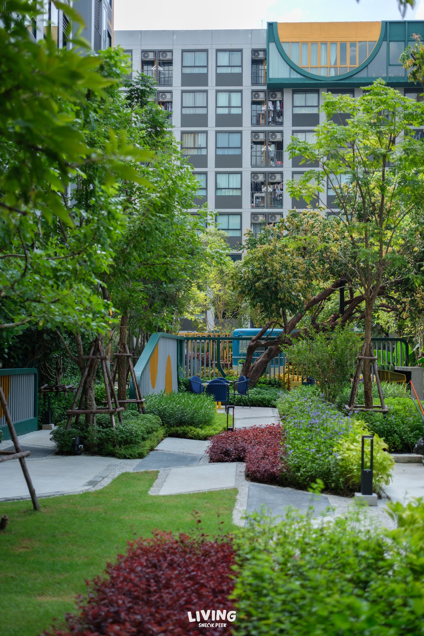 4. ตัวโครงการมีจำนวนยูนิตไม่มากแค่ 261 ยูนิต เป็นตึกเตี้ย 8 ชั้น บรรยากาศดี ผมชอบการออกแบบสวนที่อยู่ด้านในที่มันร่มรื่น มีทั้งไม้ดอก พืชผักสวนครัว สำหรับคนเลี้ยงหมานี่ต่อให้อยู่บ้านมีสวนส่วนตัวแบบผมนะ ลูกสาวก็ชอบออกมาสำรวจข้างนอกอยู่ดี การมีพื้นที่ให้นั่งเล่นในสวน มี Pet Park ที่เลือกพืชพรรณที่เป็นมิตรกับน้องมาปลูก มีอุปกรณ์ครบถ้วน ทั้งมุมนั่งพักผ่อน ของเล่น สนามหญ้า พร้อมที่ทิ้งขยะ ก๊อกล้างเท้าน้อง มีก๊อกให้เราล้างมือ แถมปลั๊กไฟให้นั่งชาร์จมือถือเล่นนี่คือคิดมาเผื่อคนเลี้ยงด้วย เหมาะมาก