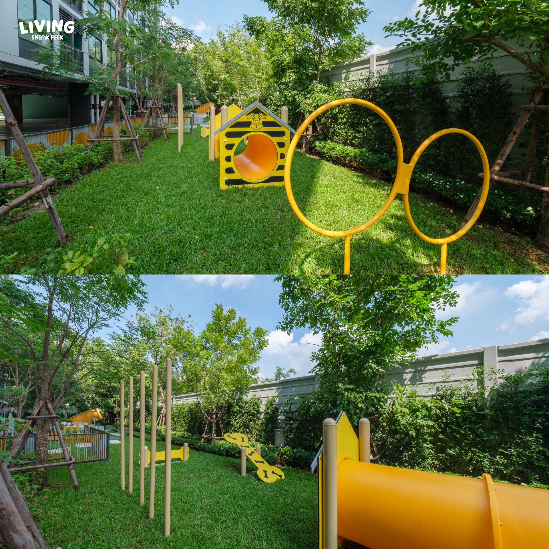 ระหว่างทางมีเสาสำหรับแขวนสายจูงน้องๆ มีสนามหญ้าเขียวตลอดแนวให้วิ่งเล่น และที่นั่งให้คุณพ่อคุณแม่คอยเฝ้ามองดูแลน้องได้ รวมถึงมีที่ฝึกเดินขึ้นลงบนแท่นด้วย