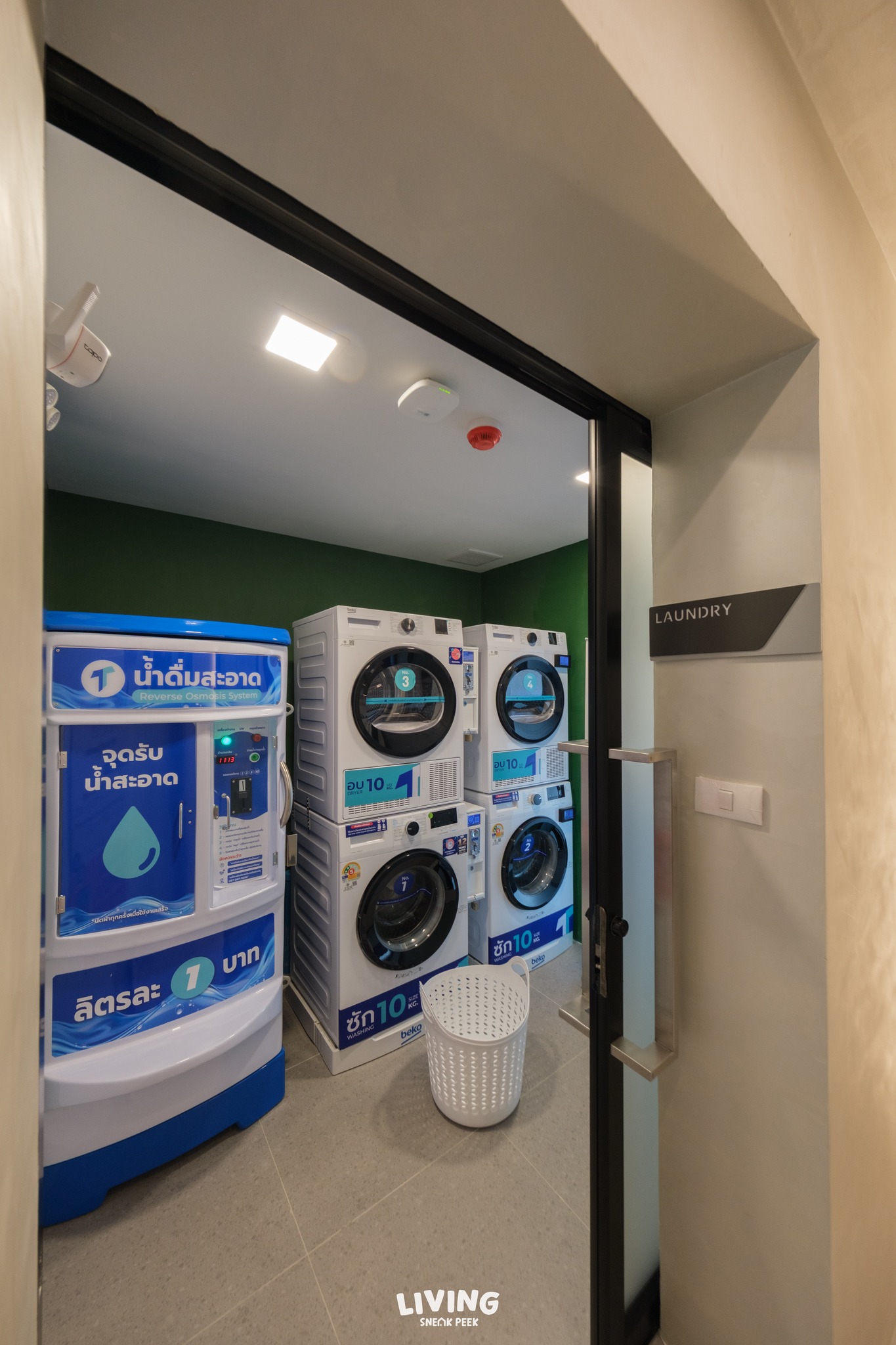 ก่อนจะเข้าลิฟต์ที่ชั้นล่างสุดนี้ยังมีห้อง Laundry พร้อมเครื่องซักผ้าและตู้กดน้ำหยอดเหรียญครบครับ ระหว่างรอผ้าก็ไปนั่งชิลล์ด้านนอกได้