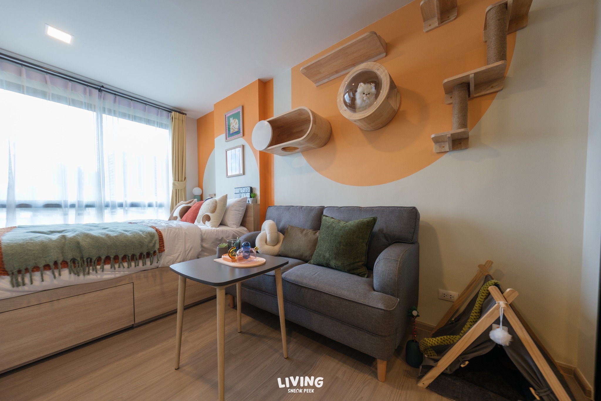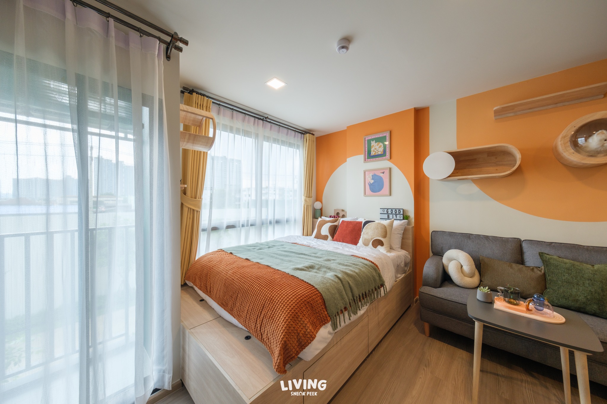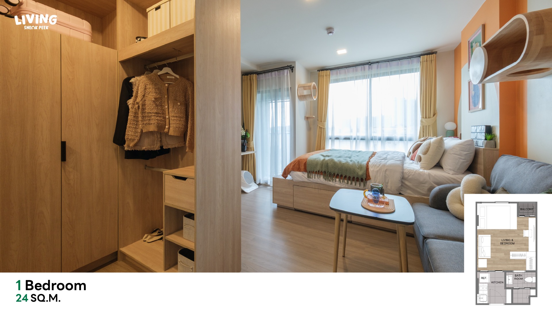 ห้องรูปแบบ 1 Bedroom ขนาด 24 ตร.ม. ที่เป็น Layout ยอดฮิตของ The Muve มีมุมแต่งตัว มุมทำงาน พักผ่อน นั่งเล่นได้ในตัวทั้งหมด ตกแต่งโทนสีส้ม สดใส