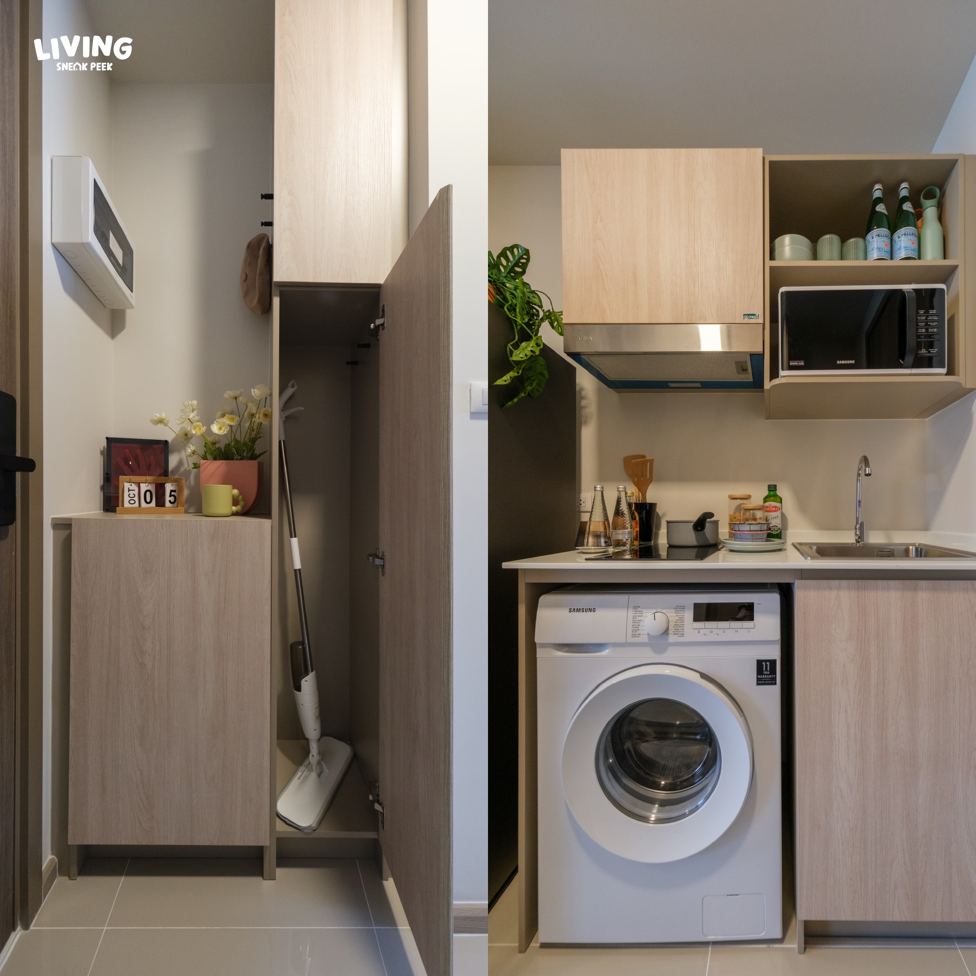 เข้าห้องมาเราจะเจอกับครัวก่อนครับ ซึ่งเค้ากั้นเป็นครัวปิดไว้ด้านหน้า บิวท์อินเคาน์เตอร์กับหน้าบานสีไม้อ่อน พร้อมเตาและที่ดูดควันจาก Teka ส่วนเครื่องซักผ้าก็วางตรงนี้ได้ครบจบ ฝั่งตรงข้ามกันเป็นตู้เก็บรองเท้า วางของ และตู้ที่เค้าทำขนาดมาเผื่อเก็บอุปกรณ์ต่างๆ ได้ครับ