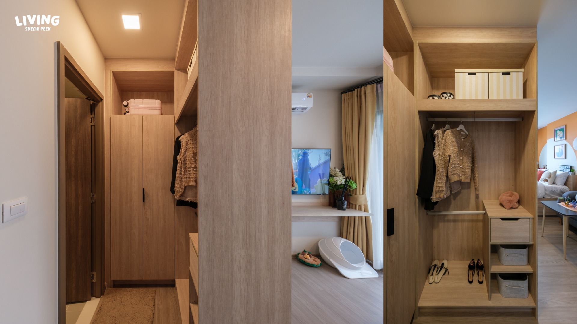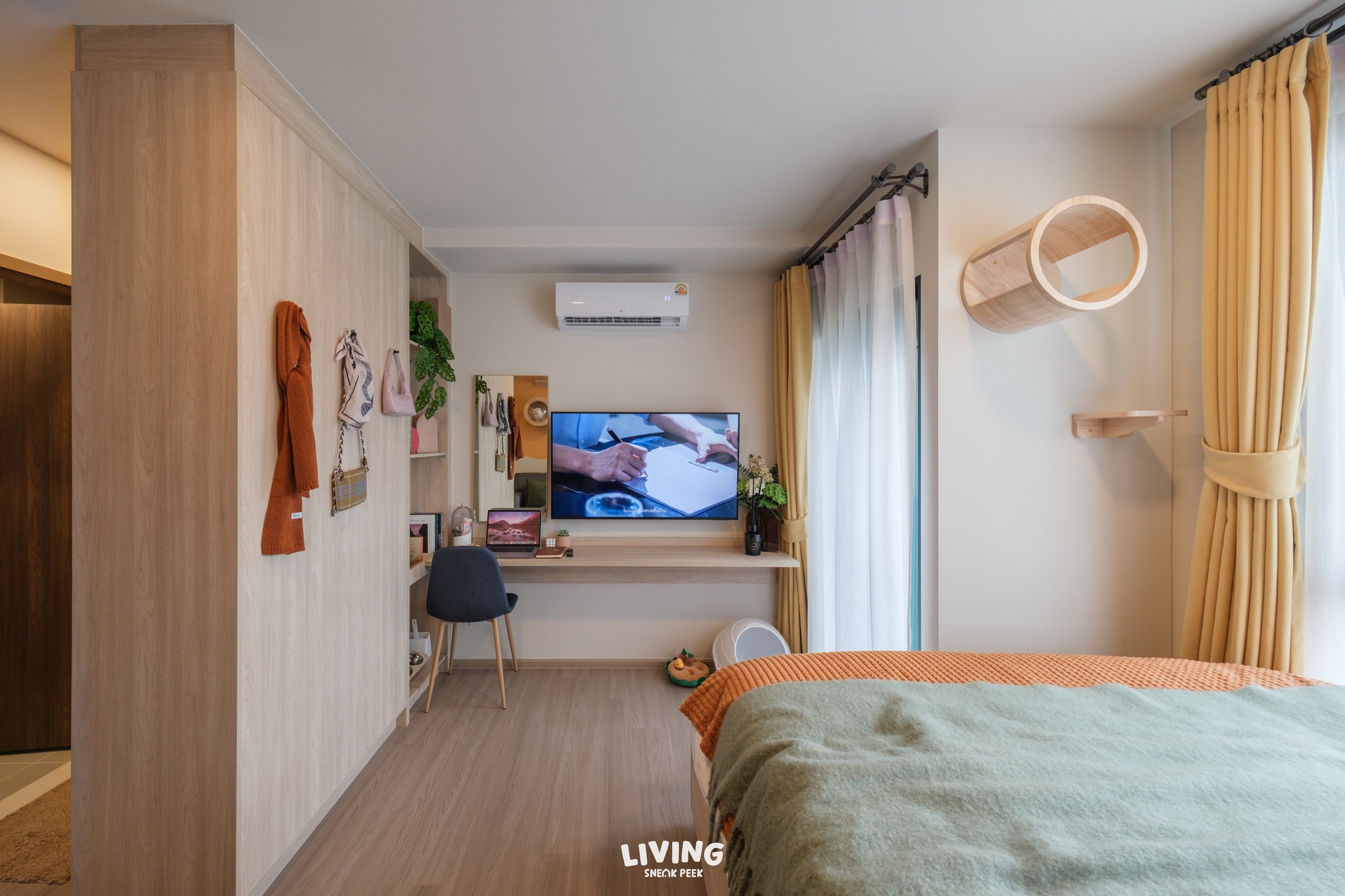 ฝั่งตรงข้ามเตียง ก็ใช้พื้นที่ได้คุ้มนะ มีทั้งที่นั่งทำงาน ชั้นเก็บของ และพื้นที่สำหรับจัดวางทีวีมาให้ครับ ส่วนตู้เสื้อผ้าก็ทำหน้าที่เป็นเสมือนตัวกั้นห้องให้เป็นสัดส่วน